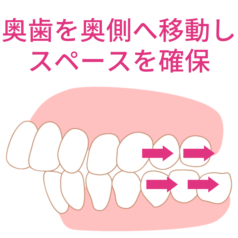 つまり斜めになった奥歯をまっすぐにして、さらに奥歯を奥側に移動して、前歯を並べるスペースを確保するのです。