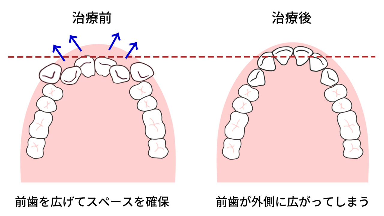 しかし、前歯しか動かせない格安矯正ではスペースを十分に確保できないので、前歯を外側に広げて治療を行います。
